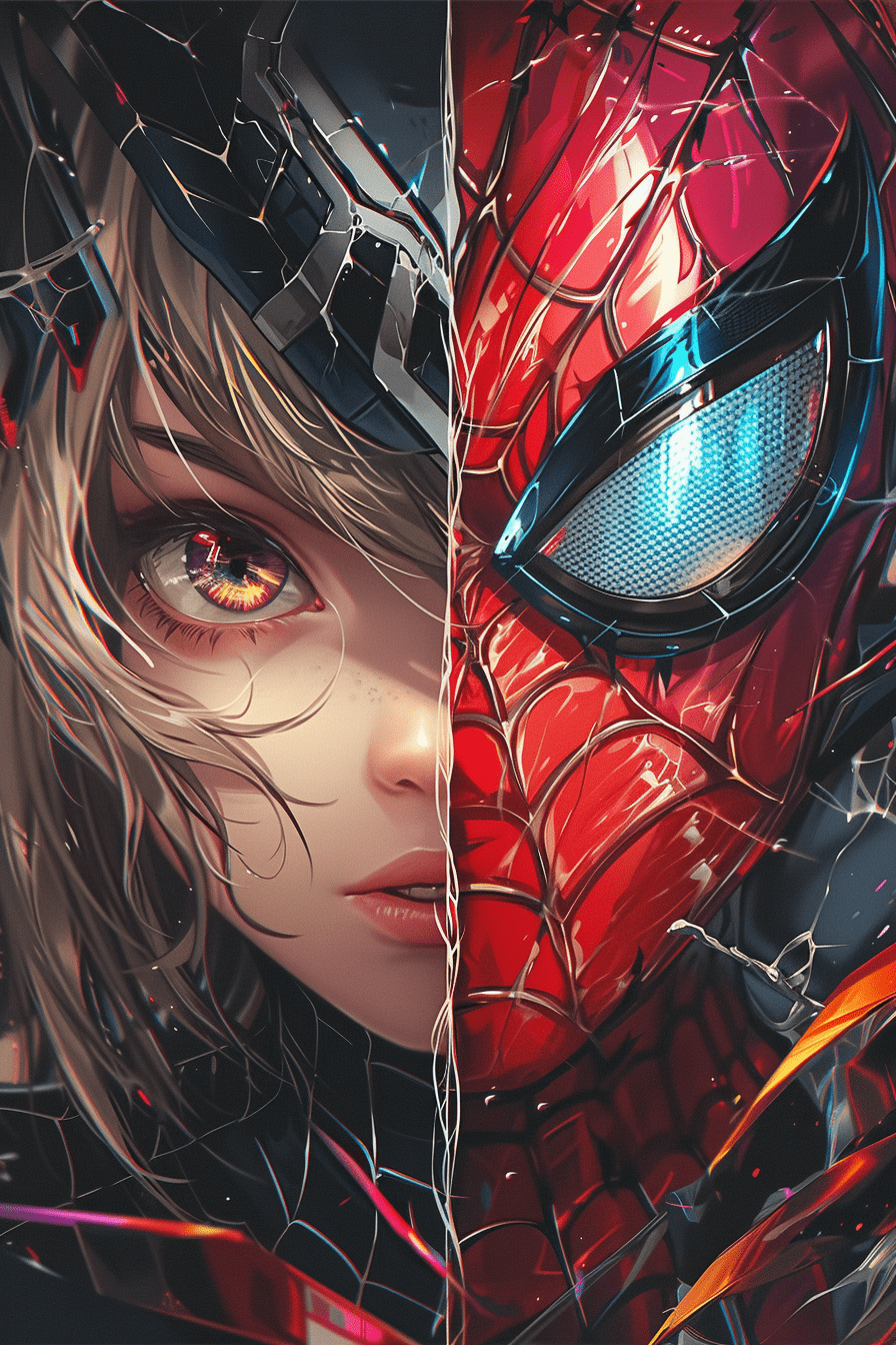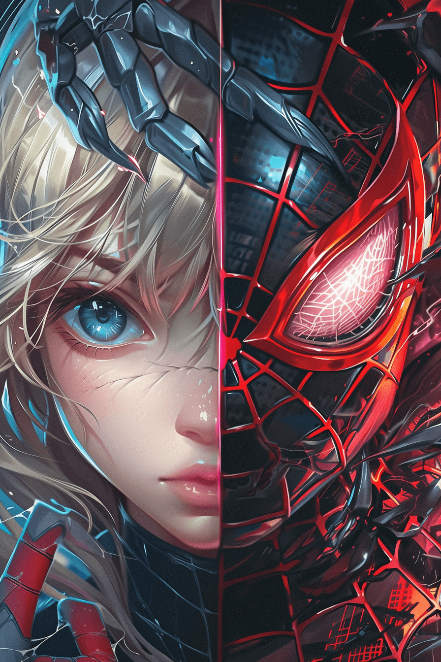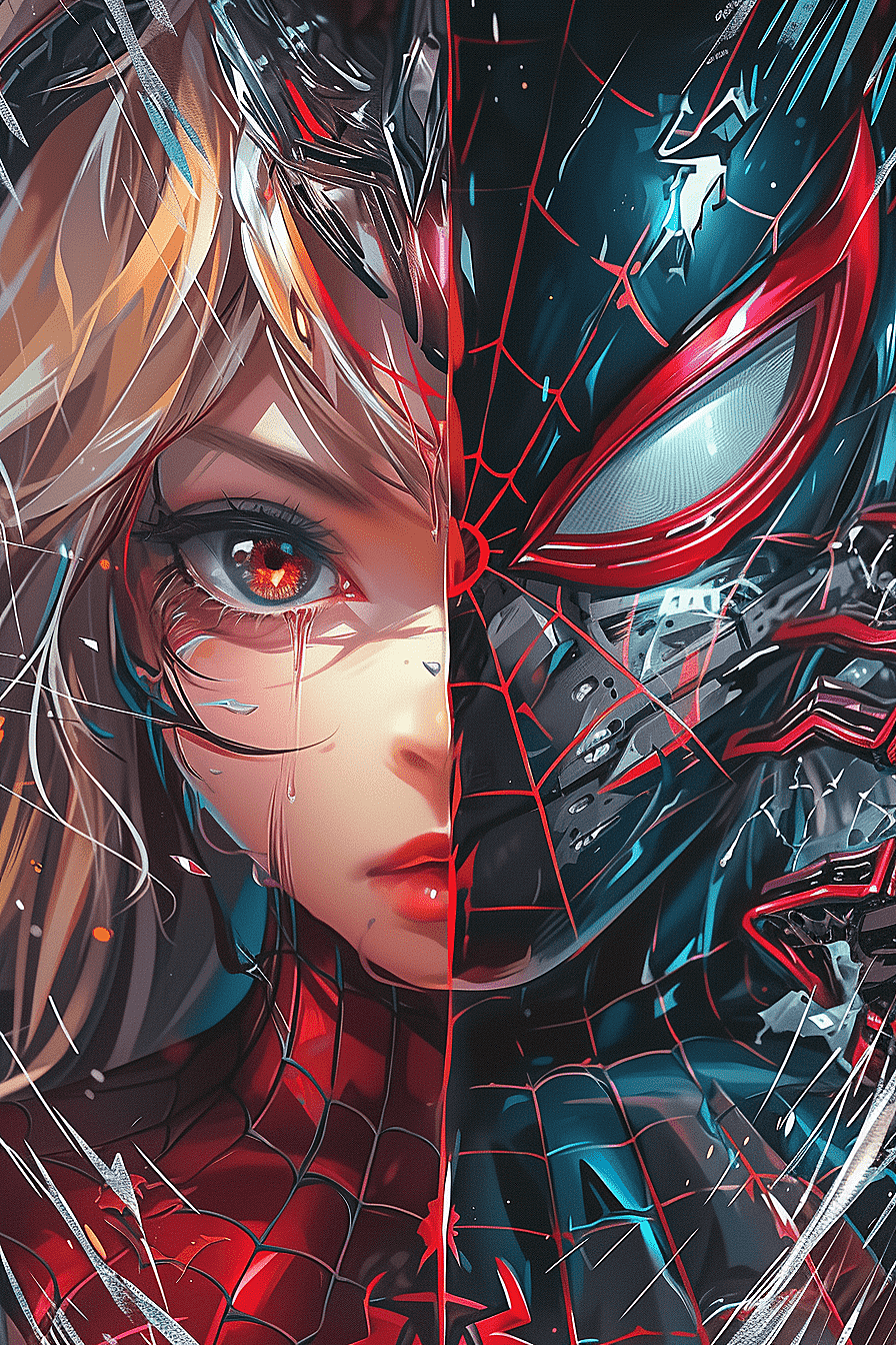 探索视觉极致,蜘蛛侠与动漫少女的面孔交织在一起,一个眼眸燃烧着红色的激情,另一个则散发着深邃的蓝色光芒。这是一幅充满aurorapunk风格的复杂构图,将机甲动漫的精髓与油画的质感巧妙融合,通过强烈的特写镜头捕捉每一个细节。在这幅作品中,轻黑色与洋红色的交织下,展现出一种生动而又深邃的视觉冲击。每一笔每一划,都彰显着艺术家对于动感插画的无限热爱与追求。