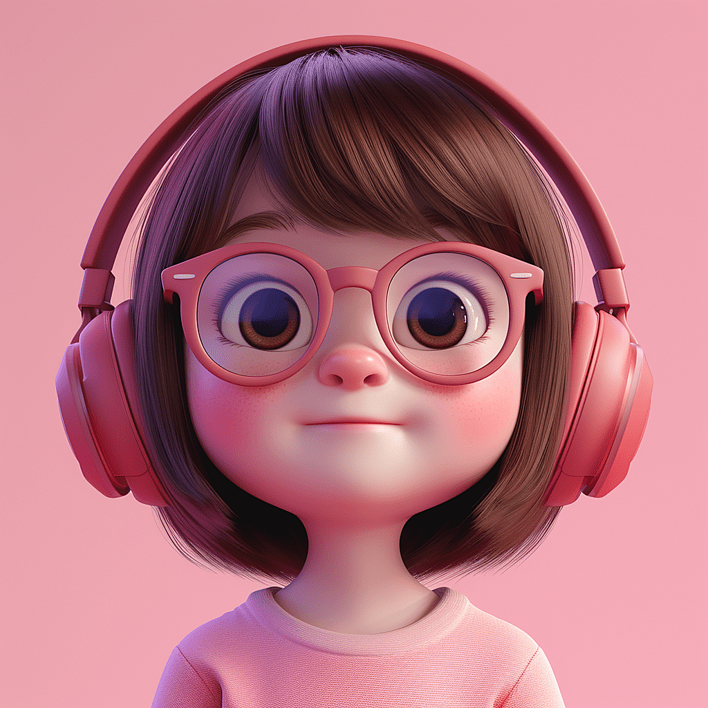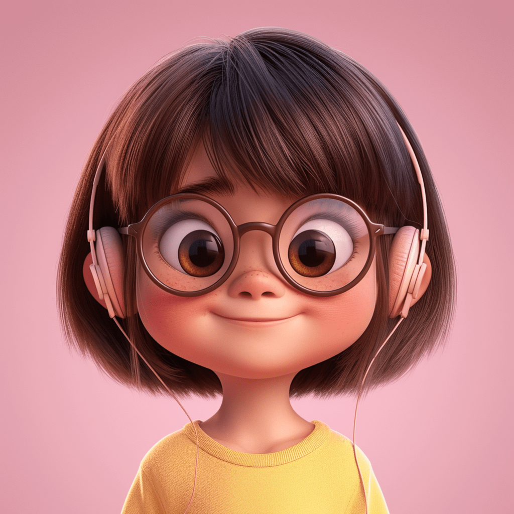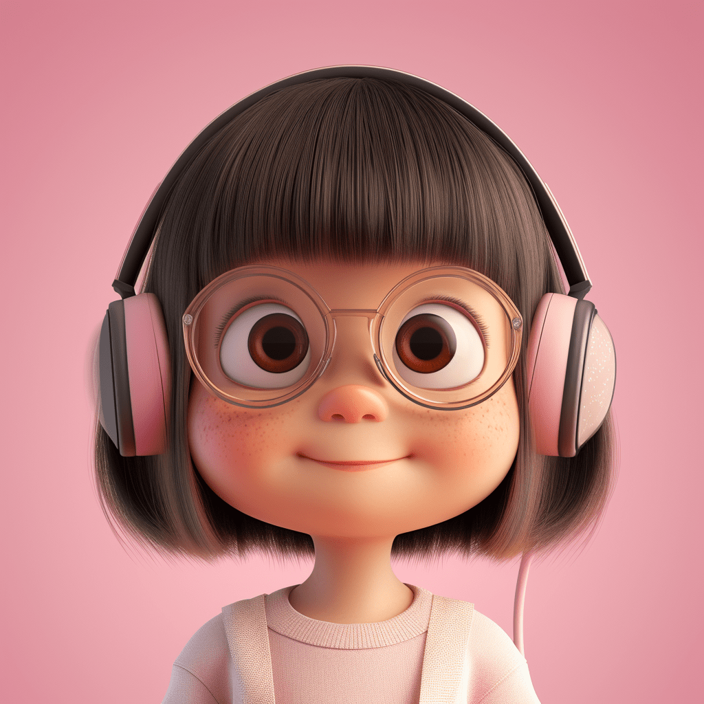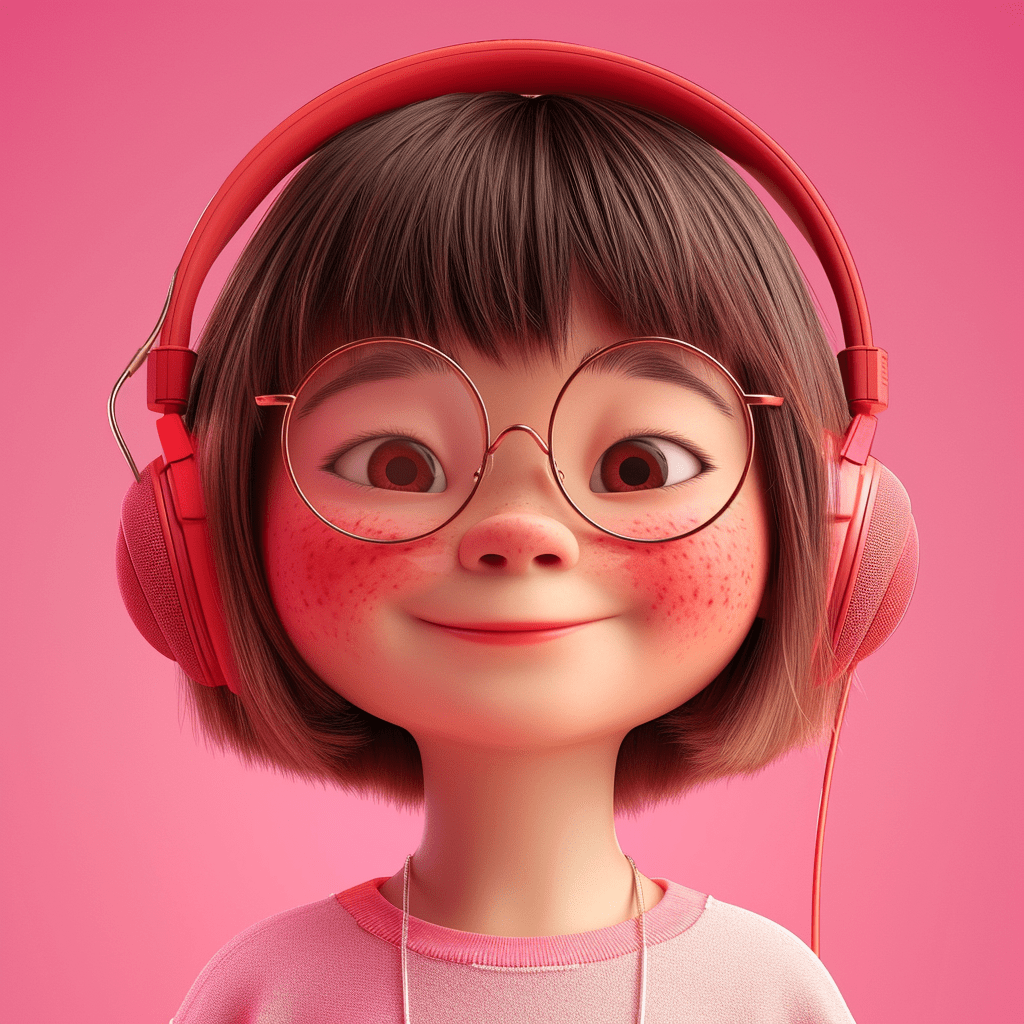 在粉嫩渐变的背景下,一位7岁小女孩的3D立体形象跃然纸上,她拥有一头柔顺的直发,散发着淡淡的金色光泽,齐刘海与肩膀齐平的波波头相得益彰。她的皮肤白皙,脸颊微微泛着粉红,圆润又略带绒感,一对小巧的深色眼睛闪烁着快乐的光芒。她戴着一副圆形的透明亚克力眼镜,耳边是那款让她心情愉悦的耳机,随着活泼的音乐轻轻摇摆。身着一件轻薄的T恤,色彩明快又充满活力,她就像是从童话世界中走出的小精灵,用她的快乐感染着每一个人。