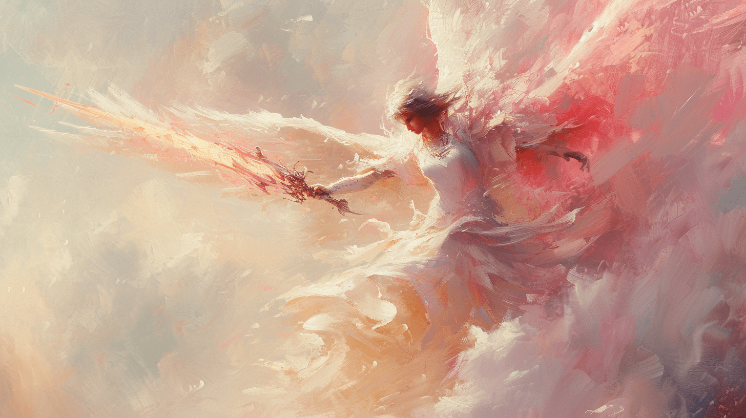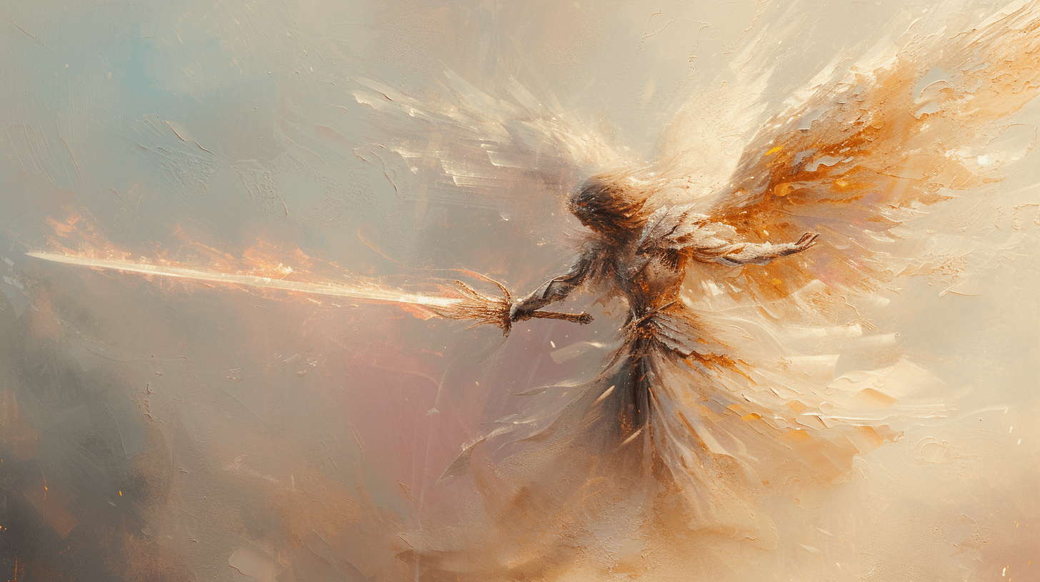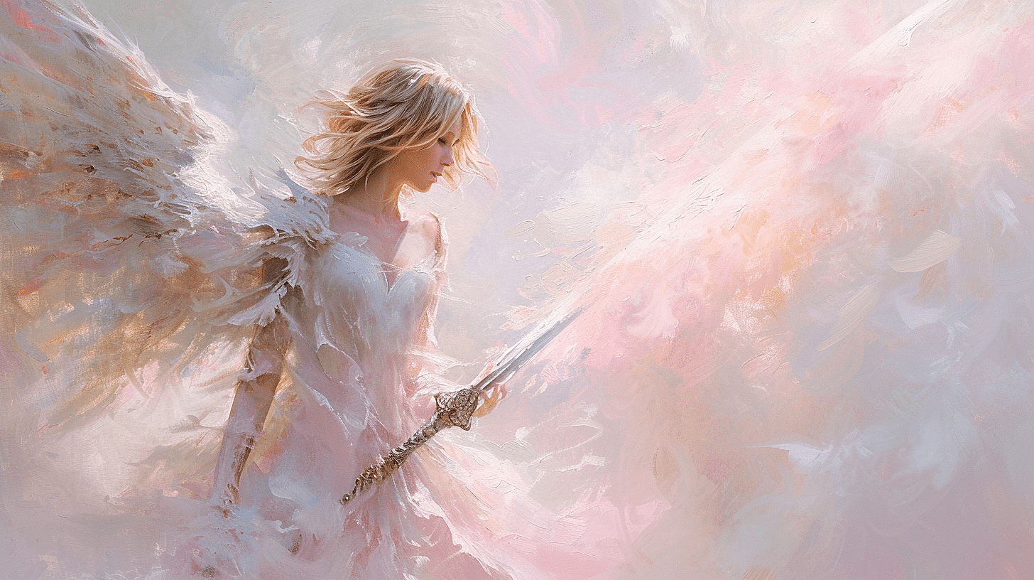 一幅描绘手持火焰之剑天使的油画,色调柔和、淡雅。这是罗伯特·诺克斯、乔纳森·霍尔或威廉·海内拉茨风格的画作,以浅白、米色和浅粉色为主调,32K超高清晰度展现了油画的细腻。画面既可爱又梦幻,手绘的细节精致入微,构图散落自然,采用了柔和的粉彩色系,色调温柔,如同壁画一般的艺术作品