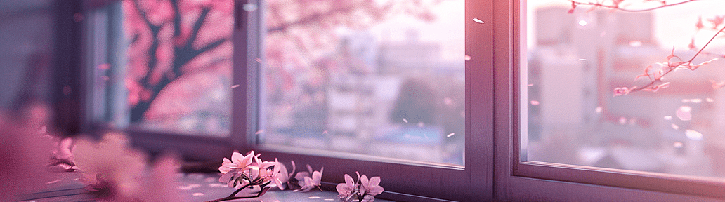 窗外盛开的樱花树与窗台上的粉红色樱花瓣形成了一幅温柔的画面