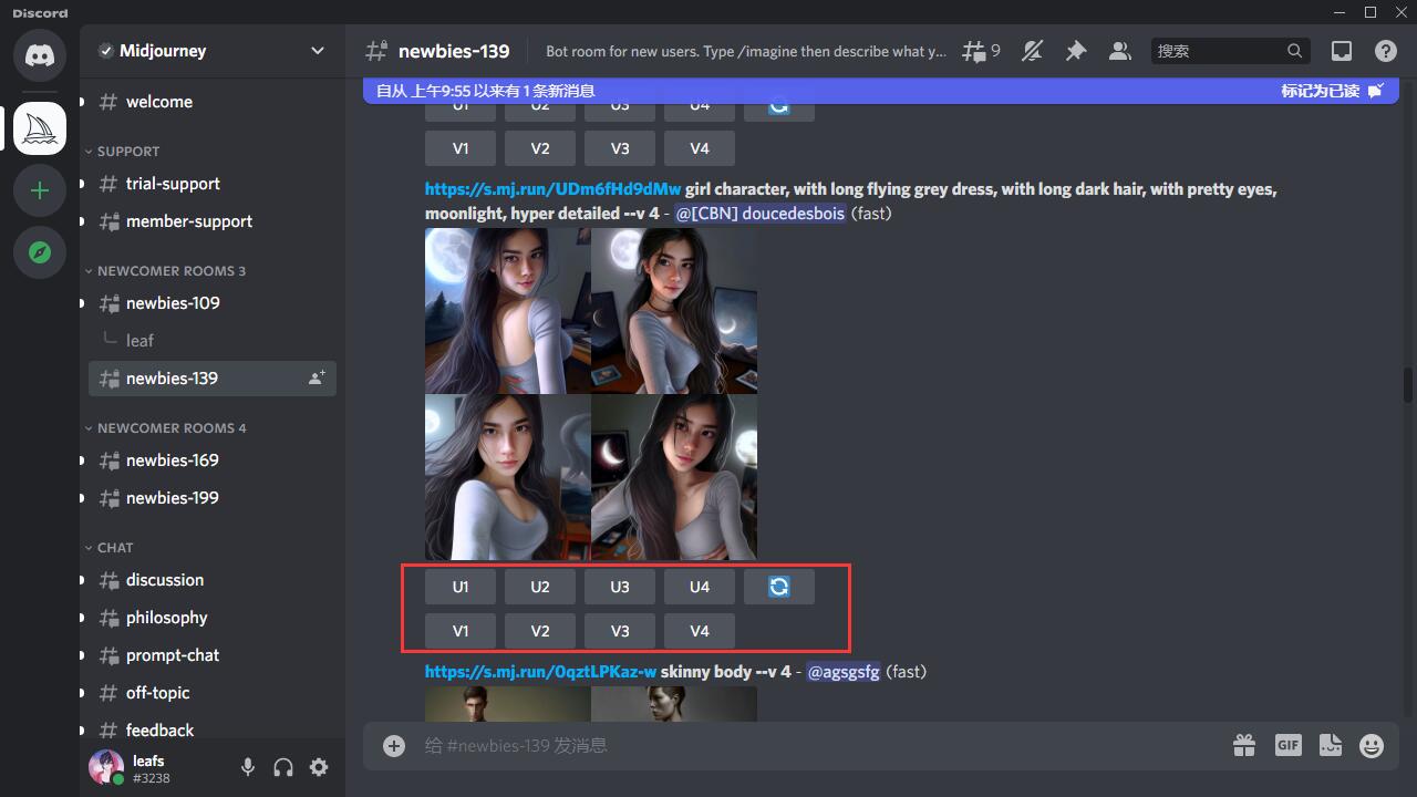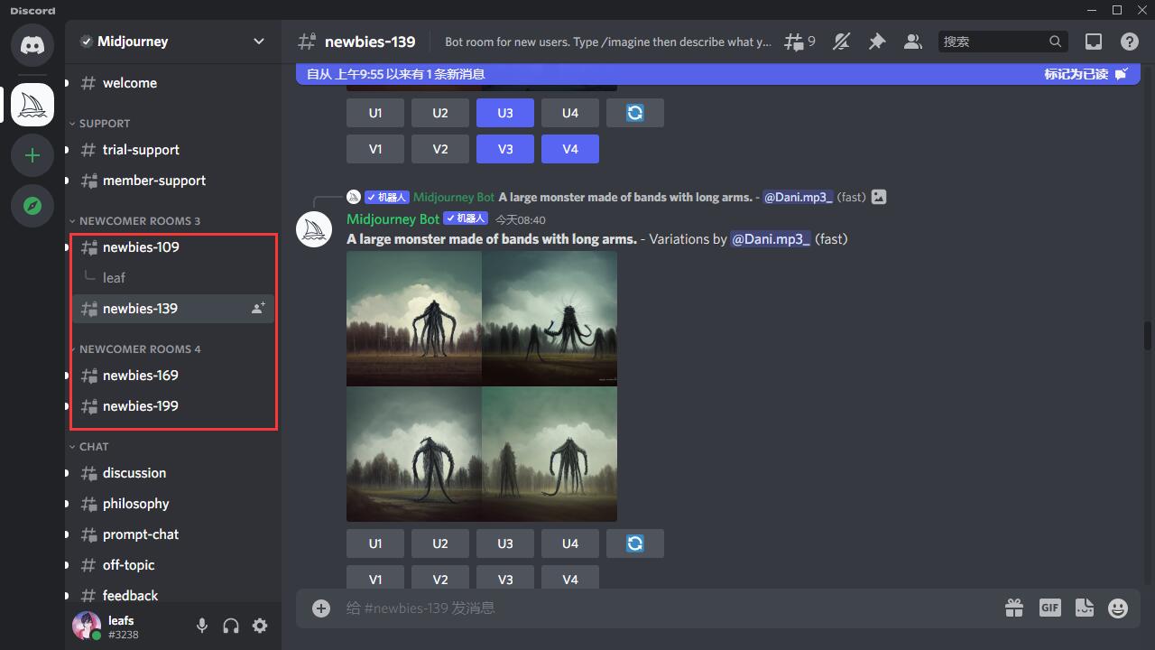 2、接下来进入正题,Discord网页版操作为例(手机版一样)进入Midjourney频道,左排有很多聊天室,拉到显示「newbies」的地方,选择频道栏 #Newbies-xx,进入频道。