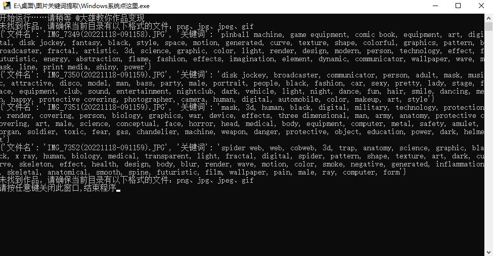 请把你的jpg格式作品拷⻉到“图片关键词提取” 这个⽂件夹⾥,直接双击“Windows系统点这⾥”即可运⾏。